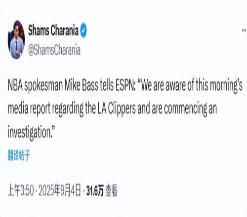 北京时间9月4日,据ESPN名记Shams报道,NBA发言人迈克-巴斯向其表示,联盟“已知晓有关洛杉矶快船队的媒体报道,并已启动调查”。据此前报道,快船队及其老板鲍尔默被指控通过向莱昂纳德支付2800万美元“挂名工作”报酬,以此规避NBA的工资帽规定。