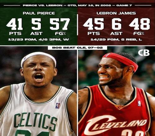 体育资讯05月19日报道宣称 17年前的今天,2008年5月18日,东部半决赛抢七,凯尔特人97-92淘汰骑士。皮尔斯和詹姆斯上演了一场传奇对决!