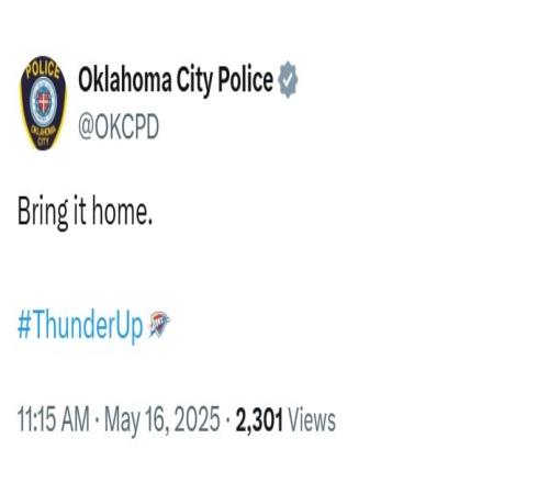 赛后,俄克拉荷马警察局官推写道:“在主场加油,雷霆雄起。”