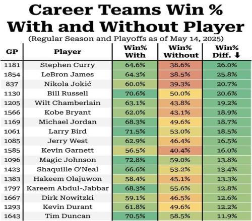 数据媒体Automatic统计了MVP球员出战和缺阵球队(常规赛+季后赛)胜率的差值(TOP17),库里26.0%排名第一,詹姆斯25.8%排名第二,排名第三约基奇差值为20.7%,列出的球员中最低的是排名第17的邓肯,差值为11.9%。