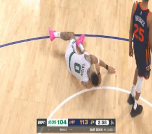 今日凯尔特人客场113-121不敌尼克斯,塔图姆在最后时刻无对抗倒地,捂着右脚踝/跟腱的位置在地上痛苦打滚。