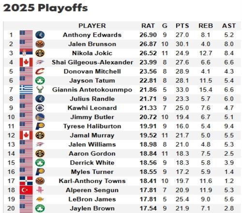 季后赛球员榜:华子小胜大头居首约梨紧随詹姆斯19登库落榜!