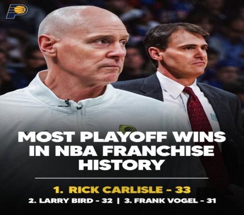 步行者官方晒出统计,这是卡莱尔在步行者第33场季后赛胜利,超越32场的伯德,独居队史第一,第三的是沃格尔的31胜。