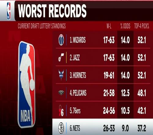 黄蜂拥有14%的概率能抽到状元签,与奇才&爵士并列第一。
