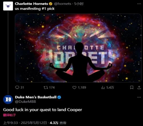 黄蜂官推“作法”杜克男篮:祝你们顺利选到弗拉格