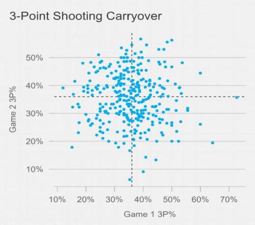 这种投篮失常不会延续到系列赛G2。事实上,系列赛首战的三分命中率对后续比赛的预测价值低得惊人。过去十年的数据显示,系列赛前两战的三分命中率之间毫无相关性。