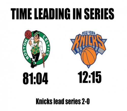 系列赛两场比赛常规时间加上一个加时共101分钟,凯尔特人领先了81分04秒,而尼克斯只领先了12分15秒的时间,但是拿到两场比赛胜利的都是尼克斯。