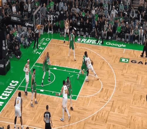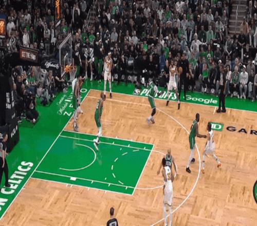 凯尔特人扑外线持球,于是哈特和唐斯们弱侧突进、前场篮板。