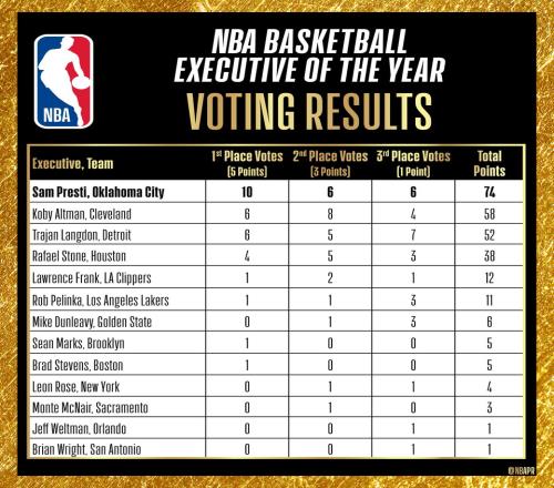 年度最佳高管得票情况:普雷斯蒂74分力压奥尔特曼佩林卡第6