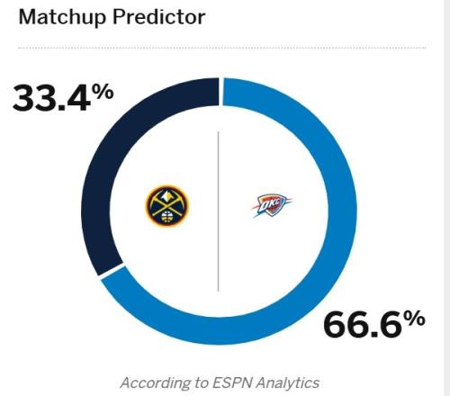 赛后,ESPN更新了两队G2的胜率,其中雷霆66.6%更被看好,掘金33.4%。