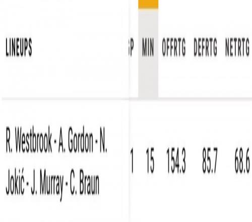据统计,今天约基奇、威少、穆雷、戈登和布劳恩同场的15分钟里,掘金进攻效率高达154.3,防守效率85.7,净效率+68.6!