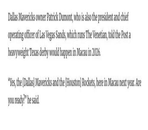 杜蒙特在接受采访时表示:“明年独行侠将与火箭在澳门交锋,你们准备好了吗?”