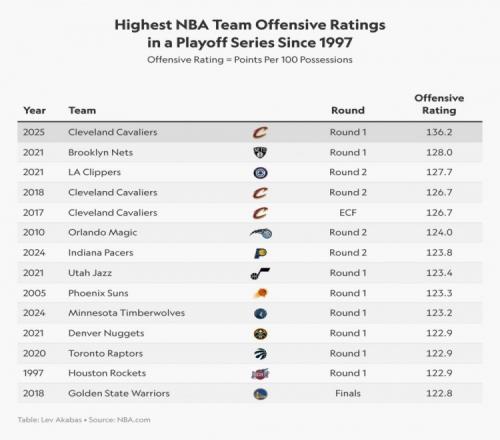 据统计,首轮系列赛中骑士进攻效率高达136.2(百回合得分),为(自1997年)有相关统计以来的历史单轮系列赛最高纪录。
