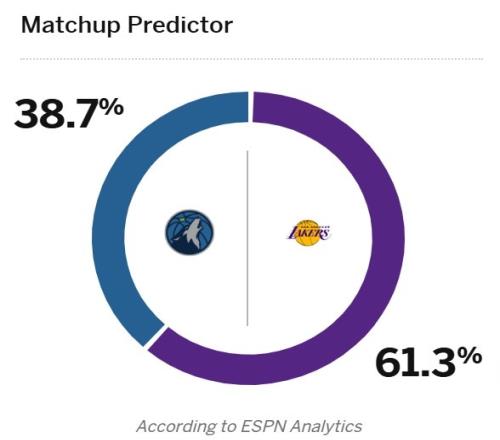今天,ESPN预测本场比赛胜率,湖人61.3%被看好,森林狼38.7%。