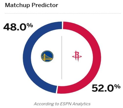 今天,ESPN预测本场比赛胜率,火箭52%略占优势,勇士48%。
