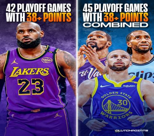 詹姆斯在与森林狼的G3中砍下38分,杜兰特生涯季后赛26次38+、库里11次、小卡8次。