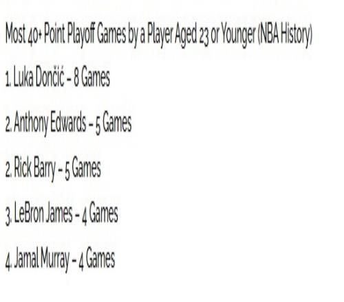 这是爱德华兹生涯第5次季后赛砍下40+,在24岁之前5次砍下40+排名历史第二,仅次于东契奇的8次。