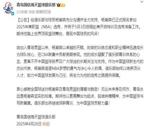 体育资讯4月26日报道宣称 今天,青岛男篮官方发文对杨瀚森做出了感谢,并表示将全力为他的选秀之路提供保障。