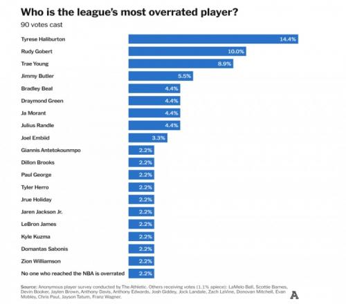 森林狼的戈贝尔和老鹰的特雷-杨分别在去年被评为联盟最被高估球员的第一和第三名。戈贝尔曾四次获得NBA年度最佳防守球员奖,包括去年,但仍有质疑者对其能力表示怀疑。