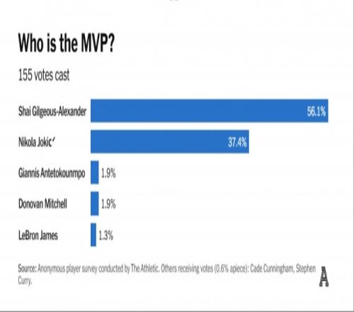 尽管约基奇本赛季表现更加出色,成为了历史上第三位在整个赛季中场均三双的球员,并带领掘金队取得了50胜的佳绩,但亚历山大在取得68胜的雷霆中扮演的重要角色,显然使他在球员的看法中占据了明显的优势。亚历山大场均得分联盟最高(32.6分),还有6.4次助攻、5个篮板、1.7次抢断和1次盖帽,他很可能会赢得他的首个MVP。大多数参与投票的球员也明确表示支持这一结果。