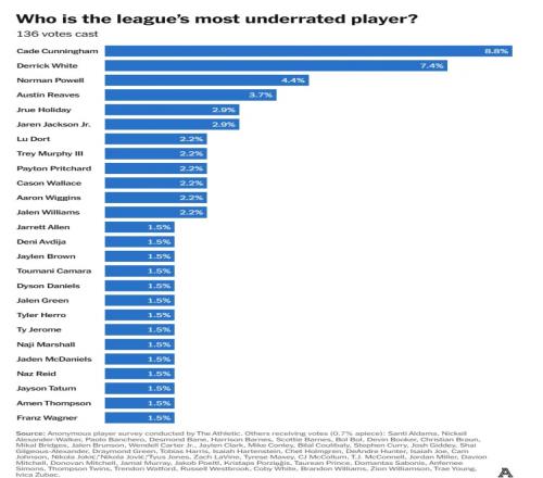 33名球员至少获得一票,这个结果与去年相同。今年,步行者的明星控卫哈利伯顿获得了14.4%的选票,而去年他仅获得3.7%。在上赛季带领步行者打入东部决赛的过程中,哈利伯顿场均贡献8.2次助攻,投篮命中率高达49%,三分球命中率为38%。然而,或许是因为步行者首轮对手雄鹿因字母哥受伤缺阵,以及次轮对手尼克斯遭遇大量伤病,使得一些投票者认为哈利伯顿在季后赛的表现被高估了。
