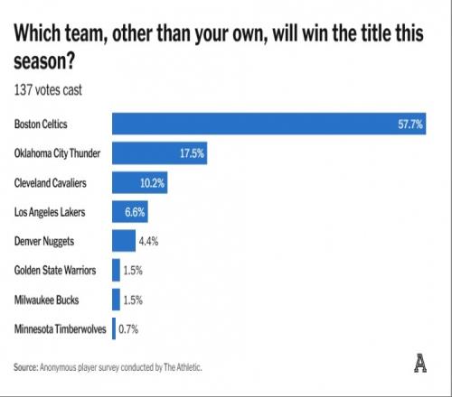 有趣的是,尽管骑士在本赛季东部战绩最佳,但在我们的调查中,他们与凯尔特人的差距仍然很大。