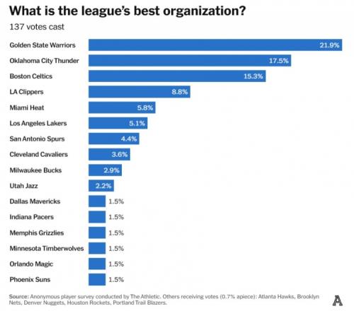 勇士排第一实至名归,即使他们没有在联盟中赢得良好声誉——而事实上他们确实有——任何一支最近取得王朝成就的球队都会自然而然地受到积极的影响。一位球员谈及他在那里效力的经历时说,这种影响是更深层次的。“他们是顶级的球队,”这位球员说,“(勇士教练)史蒂夫-科尔来自圣安东尼奥,他了解很多原则。他们在照顾球员和家庭方面做得非常好。”