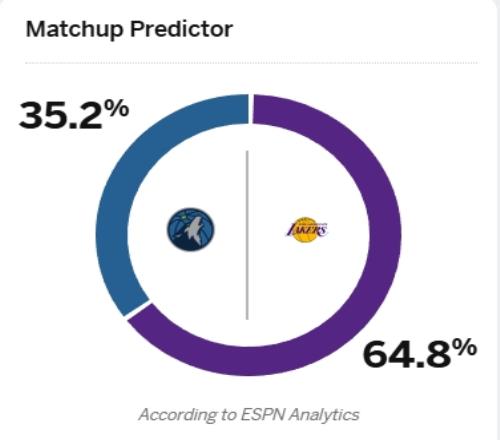 赛前,ESPN预测了本场比赛两队的获胜几率:湖人64.8%、森林狼35.2%。