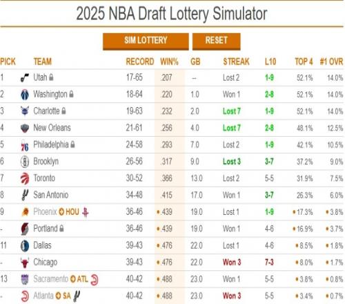 今年的14支乐透球队也全部出炉,分别是爵士、奇才、黄蜂、鹈鹕、76人、篮网、猛龙、马刺、太阳、开拓者、独行侠、公牛、国王、老鹰。