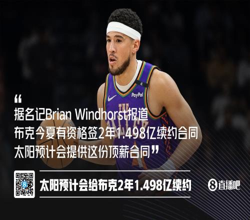体育资讯04月16日报道宣称 据ESPN名记Brian Windhorst报道,太阳球星德文-布克今年夏天有资格签下一份2年1.498亿美元的提前续约合同,多位消息人士透露,太阳预计会给布克提供这样一份顶薪合同。