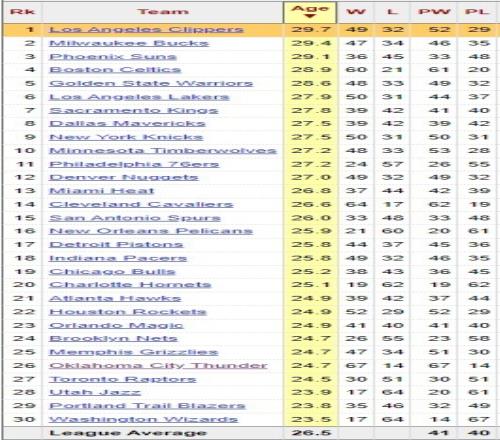 体育资讯4月13日报道宣称 本赛季,奇才阵容的平均年龄为23.5岁,是NBA30支球队中最年轻的球队,快船则以29.7岁的平均年龄,成为联盟中的最老球队,详情如下: