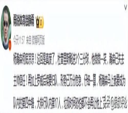 另外一个媒体人“赵探长”转发评论说道:“批评就批评球场表现,场下的我觉得真管得有点多了。杨瀚森在外面每一步都不容易,但我没想到他现在的舆论环境如此之差,今天甚至还看到有球迷跑去开拓者官推下面去骂,真是不知道该说什么。