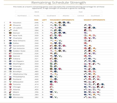 排名越高剩余赛程难度越高,排名越低剩余赛程难度越低!