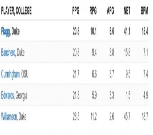将弗拉格与最近四位来自大学篮球的NBA选秀状元——锡安、爱德华兹、康宁汉姆、班凯罗的大一赛季数据进行标准化对比(所有数据按每40分钟的产量调整以确保公平性)。其中NET(净效率)与BPM(基础正负值)等高阶数据能在一定程度上体现防守影响力: