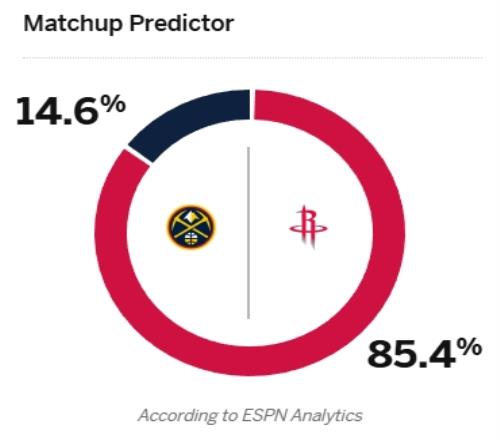 赛前ESPN给出了两队本场比赛的胜率:火箭85.4%、掘金14.6%。