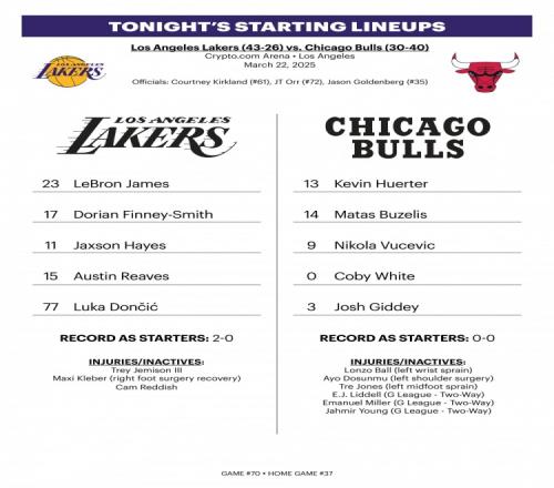 体育资讯3月23日报道宣称 上午10点半,湖人主场迎战公牛。