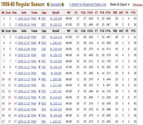 张伯伦于1959-60赛季登陆NBA,他在生涯处子秀中就27投17中爆砍43分,当时他23岁64天。更可怕的是,大帅在菜鸟赛季前8场比赛场场30+!