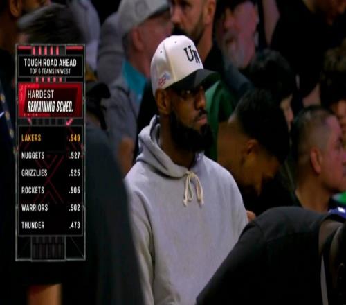 比赛进行期间,转播方列出了西部前6球队剩余的赛程难度系数(数值越大赛程越难),湖人的难度最高: