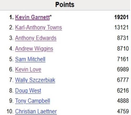 至此,爱德华兹在森林狼的总得分达到8731,超越维金斯排名队史第三。队史前四如下: