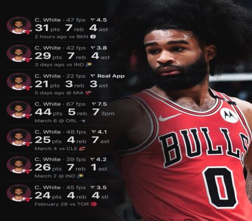 此役公牛后卫科比-怀特火力全开,打了36分钟24投12中,三分8中3、罚球4中4砍全场最高31分外加7篮板4助攻1抢断,正负值+7。