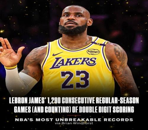 詹姆斯从2007年开始这一纪录,期间曾多次险些中断。例如,去年10月在对阵太阳的比赛中,詹姆斯在比赛还剩两分钟时仅得7分,但随后命中一记三分球将该纪录延续。2021年,詹姆斯在一场比赛严重扭伤脚踝后仍命中一记三分球,将得分提升至10分,随后才返回更衣室。詹姆斯在2018年超越了乔丹此前保持的866场连续得分上双纪录。唯一接近这一纪录的现役球员是詹姆斯-哈登,但他的纪录在上赛季因腿筋受伤中断,最终停留在450场。在此期间,詹姆斯只有在两场季后赛中得分未上双,最近一次是在2014年对阵步行者的比赛中仅得7分。
