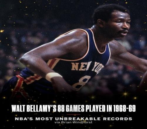 1968-69赛季,沃尔特-贝拉米起初效力于尼克斯,打了35场比赛。随后他被交易到活塞,由于赛程安排的特殊性,他在活塞又打了53场比赛,使他的赛季总出场数达到了88场。NBA历史上共有42次球员单赛季出场数超过82场,最近一次是上赛季的希尔德,效力步行者和76人共计84场比赛。历史上仅次于贝拉米的是汤姆-亨德森,后者在1976-77赛季为子弹队和老鹰共打了87场比赛。