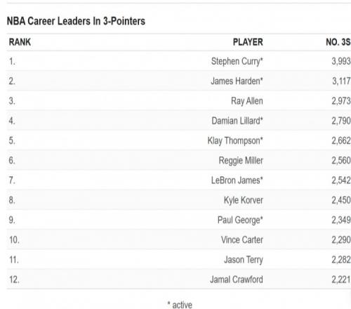 目前,雷-阿伦以历史第三的三分球命中总数排在库里和哈登之后,而利拉德(98%的概率)和克莱(97%的概率)几乎肯定将在一两年内超越雷-阿伦。
