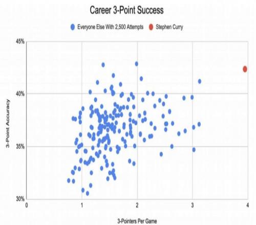(图为生涯至少出手2500记三分球的球员三分投射情况,横轴为场均三分命中数,纵轴为三分命中率,红点为库里)