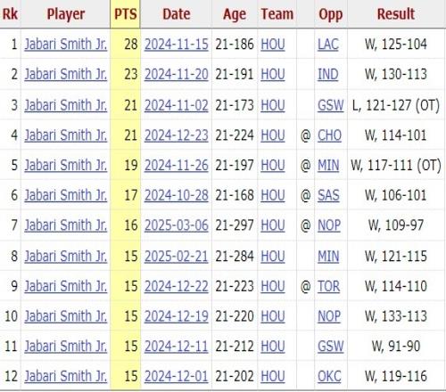据统计,贾巴里-史密斯本赛季得分15+的比赛火箭12胜1负,只输给勇士。