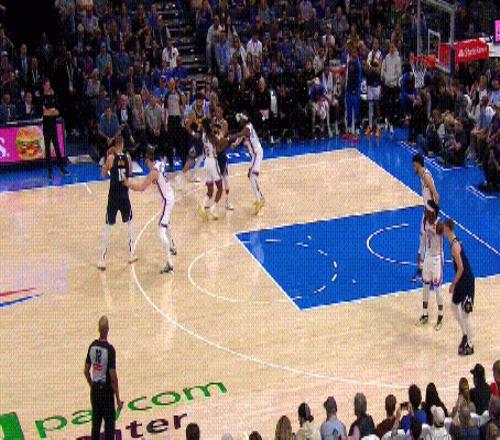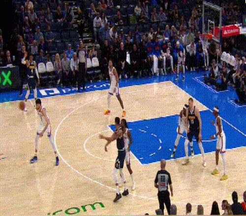 下面这个进球,或许更能反映约基奇尝试持球进攻的难度——怎么都无法在里面拿到球后,他从三分线硬钢进去压哨打进。
