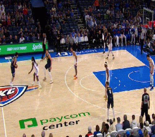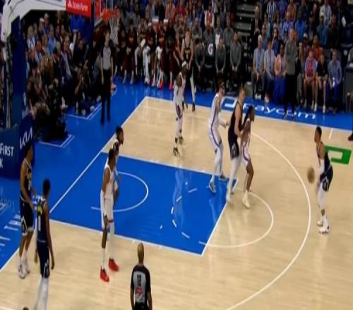 即使约基奇接到了球,在他有效发起进攻前,强侧夹击和提前轮转都会到来——注意卡鲁索的站位,他能兼顾到穆雷和波特,而布劳恩完全在SGA的覆盖半径内。