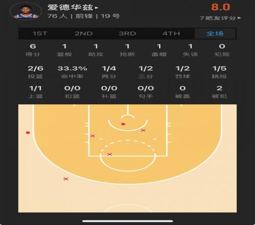 76人落选秀 贾斯汀-爱德华兹 登场20.5分钟