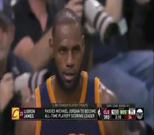 在超越贾巴尔成为常规赛历史得分王的近六年前,詹姆斯在2017年东部决赛第五场比赛中命中一记左翼三分球,成功超越乔丹成为季后赛历史得分王。詹姆斯全场比赛砍下35分,率领骑士以135比102战胜凯尔特人,帮助骑士连续第三年晋级NBA总决赛,这也是詹姆斯个人连续第七年进入总决赛。