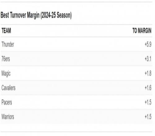 4、雷霆的阵容深度和净胜分让主教练戴格诺特无需过度使用主力球员。雷霆只有两名球员场均上场时间超过29分钟,亚历山大场均上场时间在联盟中排名第33位,杰伦-威廉姆斯排名第48位。目前排名联盟第一的骑士也是如此,他们队内上场时间最多的米切尔在联盟中排名第71位。由于雷霆和骑士在各自分区中领先优势巨大(雷霆在西部领先第二的湖人11个胜场差,骑士在东部领先第二的凯尔特人8个胜场差),两队都有条件让主力球员在季后赛开打前保持充沛的体能。